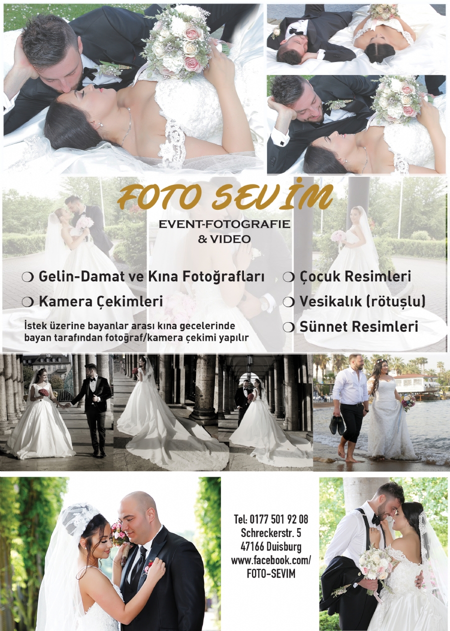 1987 yilinda fotografcilik hayatina baslayan Foto Sevim, 2009 yilindan itibaren Duisburg`da studyosunu acarak faaliyetini surdurmektedir. Professionelle Foto- & Videographin im Bereich * Hochzeit * Verlobung * Ball * Event * Party Fotografie